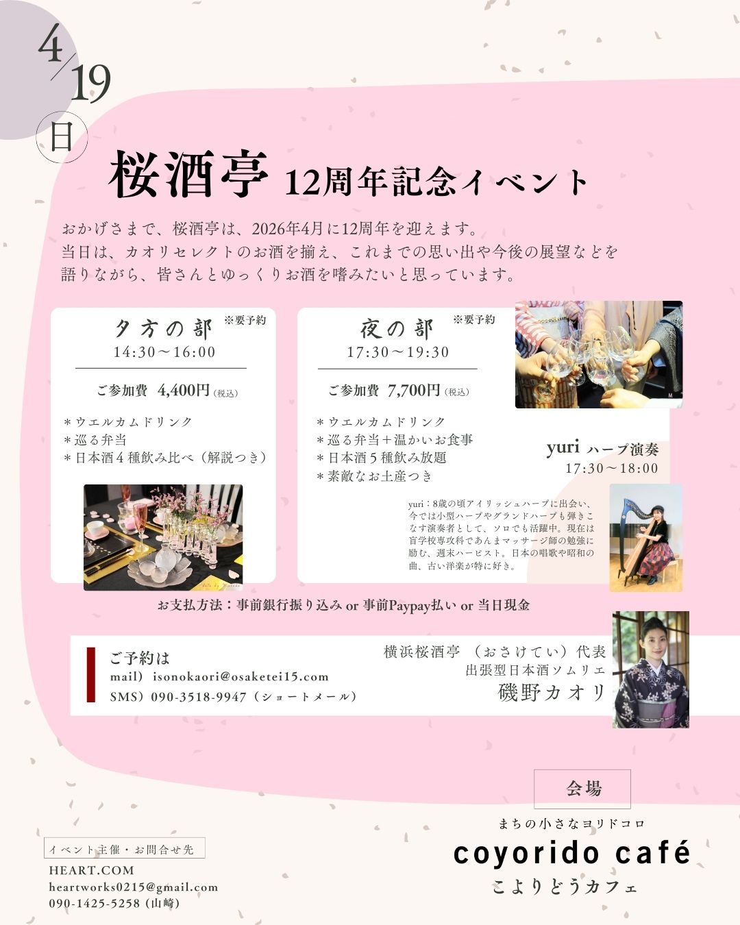 桜酒亭は2026年4月に12周年を迎えます。当日はカオリセレクトのお酒を揃え、これまでの思い出や今後の展望などを語りながら、皆さんとゆっくりお酒を嗜みたいと思っています。夜の部はyuriさんによるハープ演奏も!