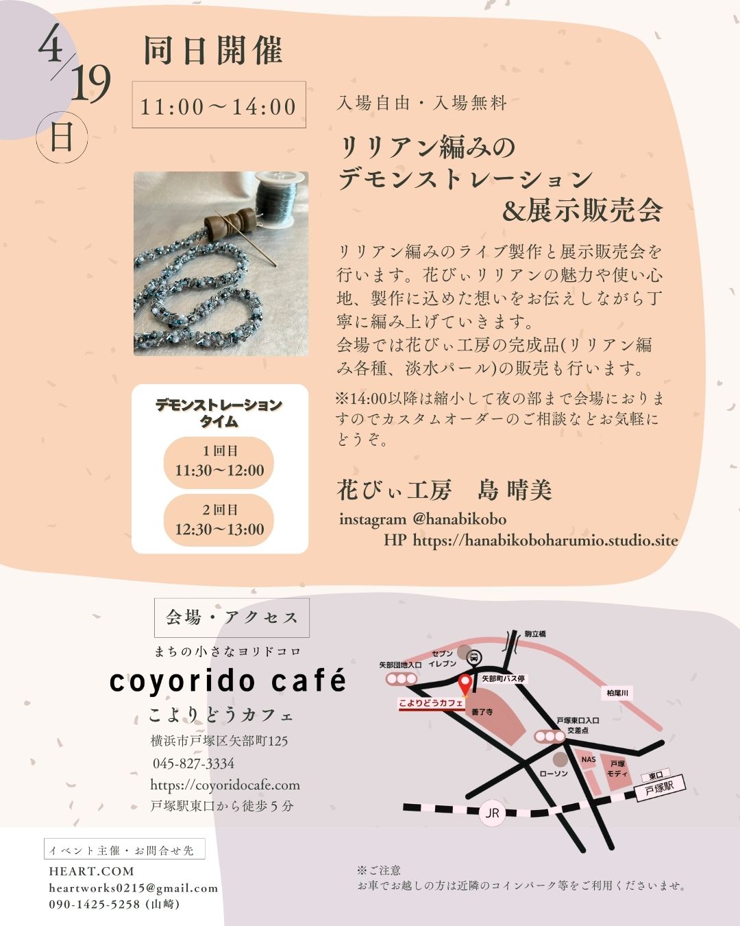 花びぃ工房のリリアン編み、デモンストレーション&展示販売会を開催します。デモンストレーションタイムは、11:30~と12:30~(各30分)リリアン編み各種、淡水パールの販売も行います。